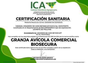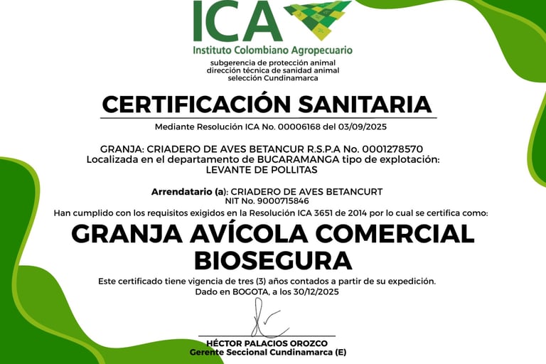 Aves criadas desde el 1° día hasta la semana 16 en granjas bioseguras, contamos con la certificación GAB emitida por el ICA, se entregan con el esquema de vacunación completo así que están listas para iniciar producción.